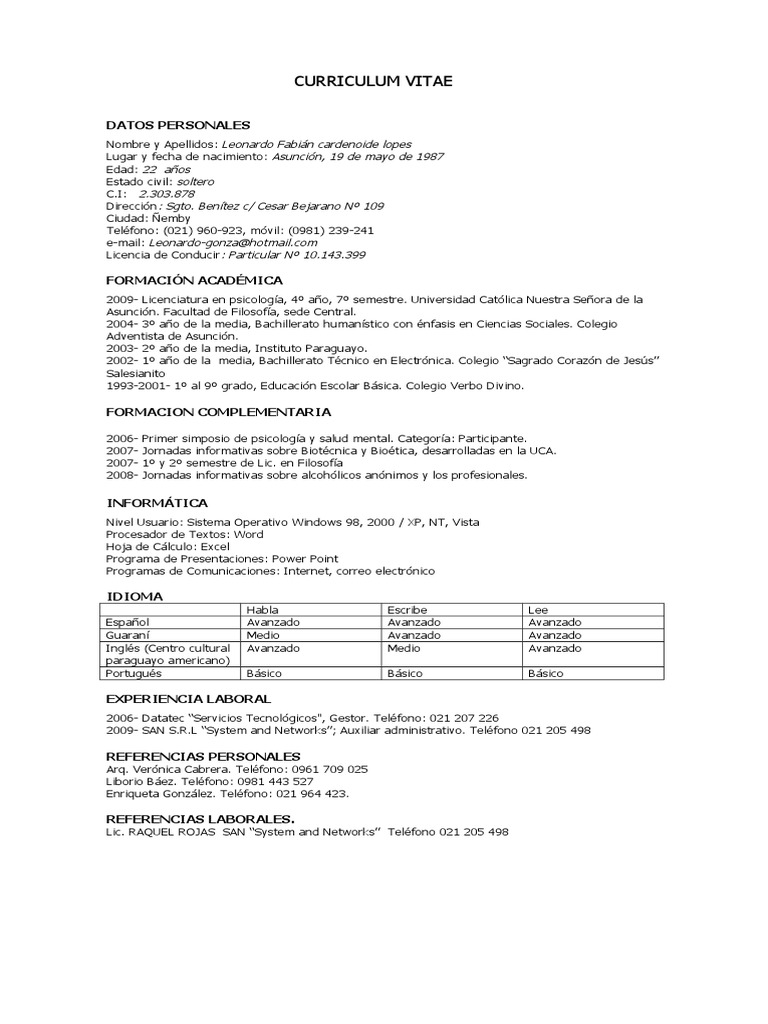 Modelo De Curriculum Vitae En Blanco De Paraguay / Modelo De Curriculum Vitae En Blanco De Paraguay Curriculum Vitae Pedro Guillermo Adorno El Diseno De Tu Curriculum Vitae Pdf Puede Ser Un Factor Determinante Para Llamar La Atencion De. Antes de entregar un currículum vitae en pdf, hay que asegurarse que además de poder ser leído por programas ats (applicant tracking todo el mundo tiene un cv, así que para conseguir la entrevista el tuyo debe destacarse del resto de candidatos. Tan sólo elige entre las más de 18 plantillas de currículum abajo, añade el contenido, descárgalo y consigue ese trabajo. Seja em papel ou em formato digital, um curriculum vitae bem redigido permite. Modelos cv e exemplos cv livres, modelos cv, modelo de curriculum vitae, currículos, como fazer um currículo. By miguel_ramirez_217 in types > creative writing, curriculum vitae, and territorio paraguayo.